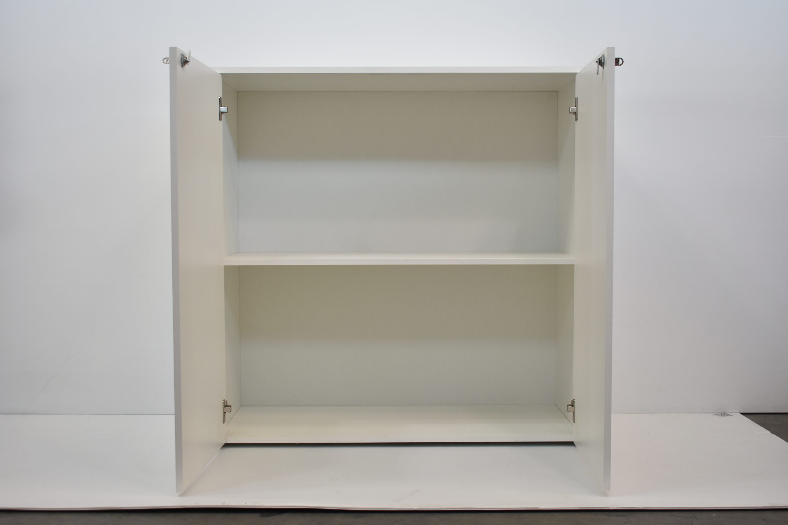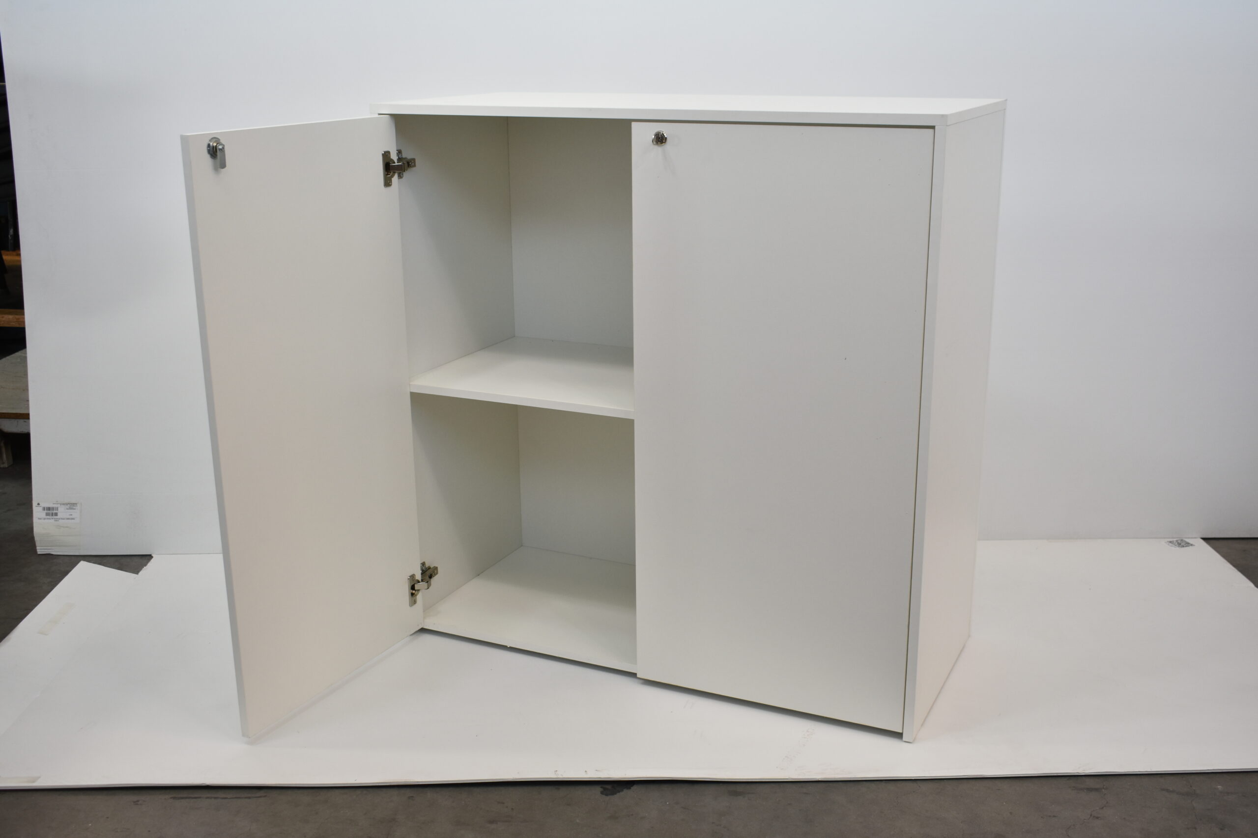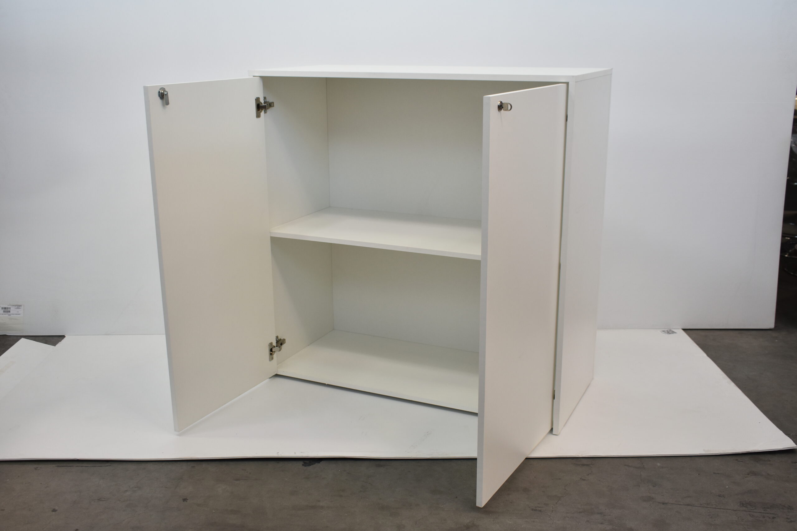 Balcão branco em aglomerado de madeira, com prateleira no interior, portas e fechadura.