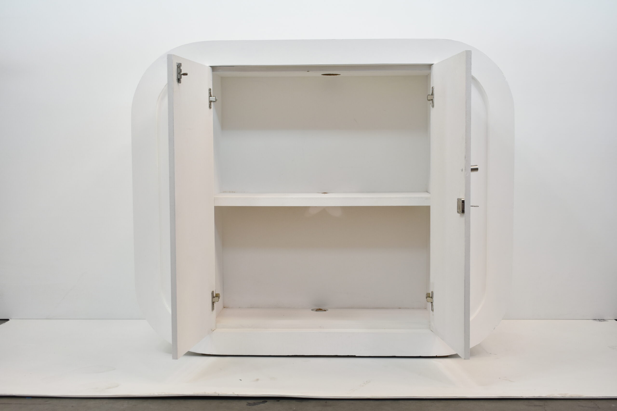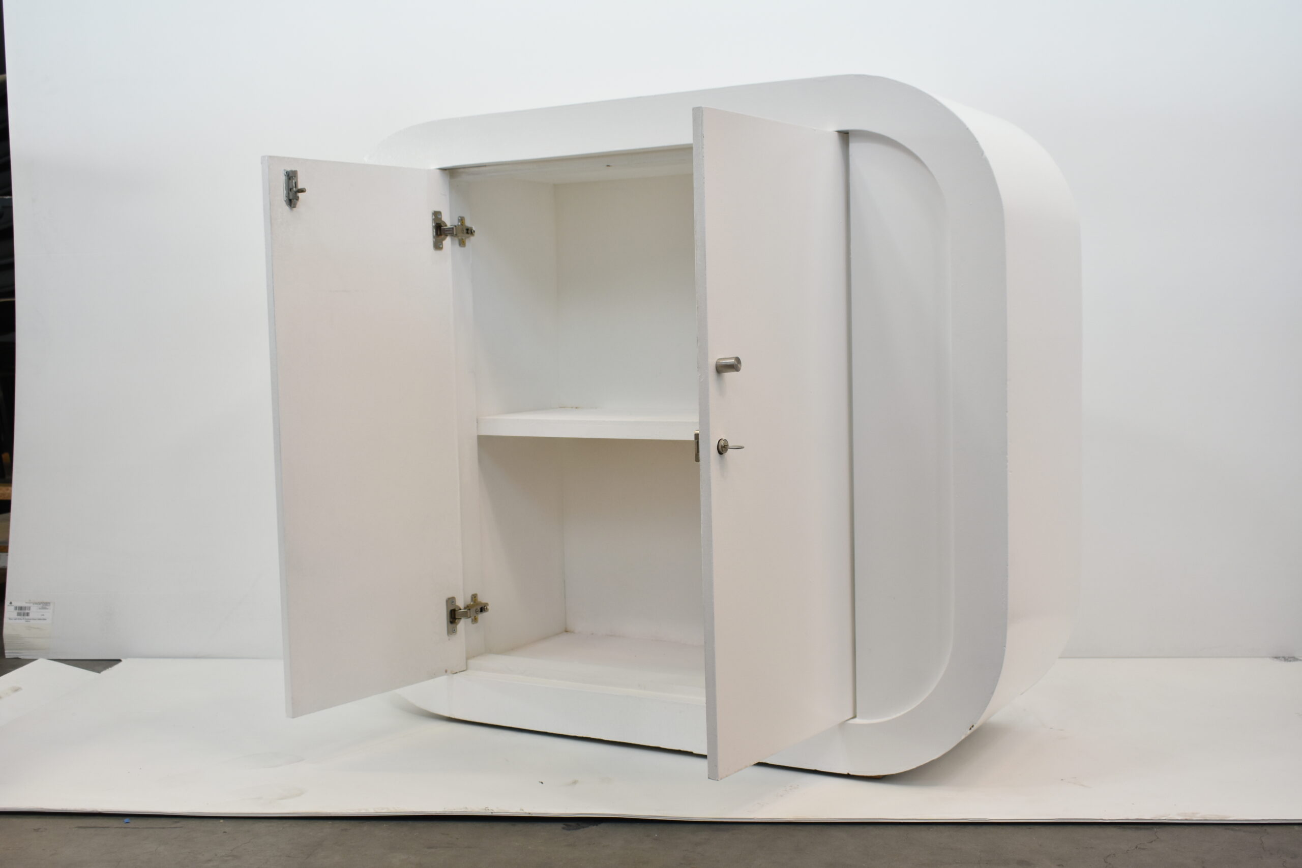 Balcão branco em madeira com prateleira, portas e fechadura.